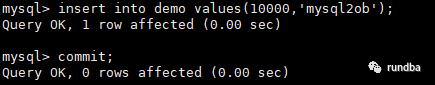 mysql> insert into demo values(10000,'mysql2ob');Query OK, 1 row affected (0.00 sec)mysql> commit;Query OK, 0 rows affected (0.00 sec)