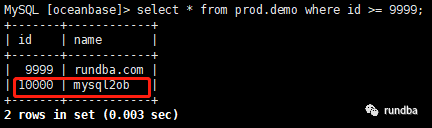 MySQL [oceanbase]> select * from prod.demo where id >= 9999;+-------+------------+| id | name |+-------+------------+| 9999 | rundba.com || 10000 | mysql2ob |+-------+------------+2 rows in set (0.003 sec)