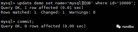 mysql> update demo set name='mysql到OB' where id='10000';Query OK, 1 row affected (0.01 sec)Rows matched: 1 Changed: 1 Warnings: 0mysql> commit;Query OK, 0 rows affected (0.00 sec)