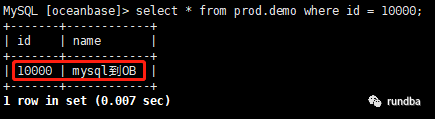 MySQL [oceanbase]> select * from prod.demo where id = 10000;+-------+------------+| id | name |+-------+------------+| 10000 | mysql到OB |+-------+------------+1 row in set (0.007 sec)