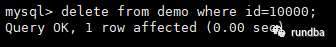 mysql> delete from demo where id=10000;Query OK, 1 row affected (0.00 sec)