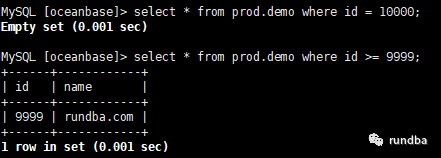 MySQL [oceanbase]> select * from prod.demo where id = 10000;Empty set (0.001 sec)MySQL [oceanbase]> select * from prod.demo where id >= 9999;+------+------------+| id | name |+------+------------+| 9999 | rundba.com |+------+------------+1 row in set (0.001 sec)