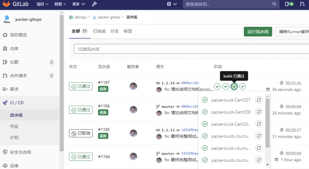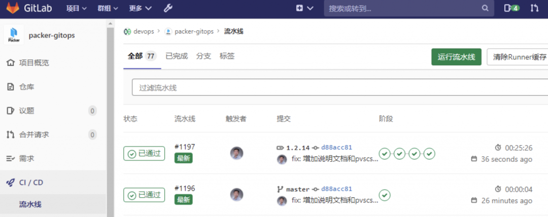 当提交变更后,Gilab CI/CD会基于.gitlab-ci.yml中的配置自动执行流水线,整个过程分为2组5个步骤: