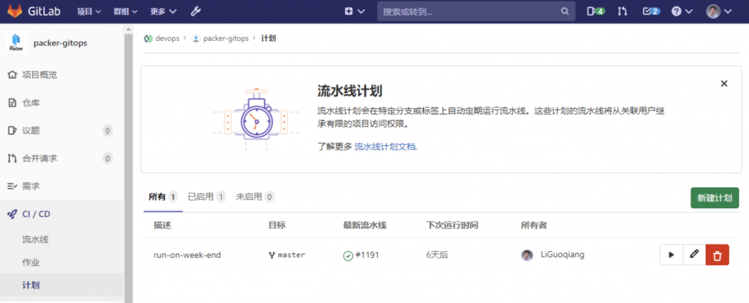在Gitlab CI/CD的计划中,添加一个每周/月的定时执行计划,添加完成后如下图所示。