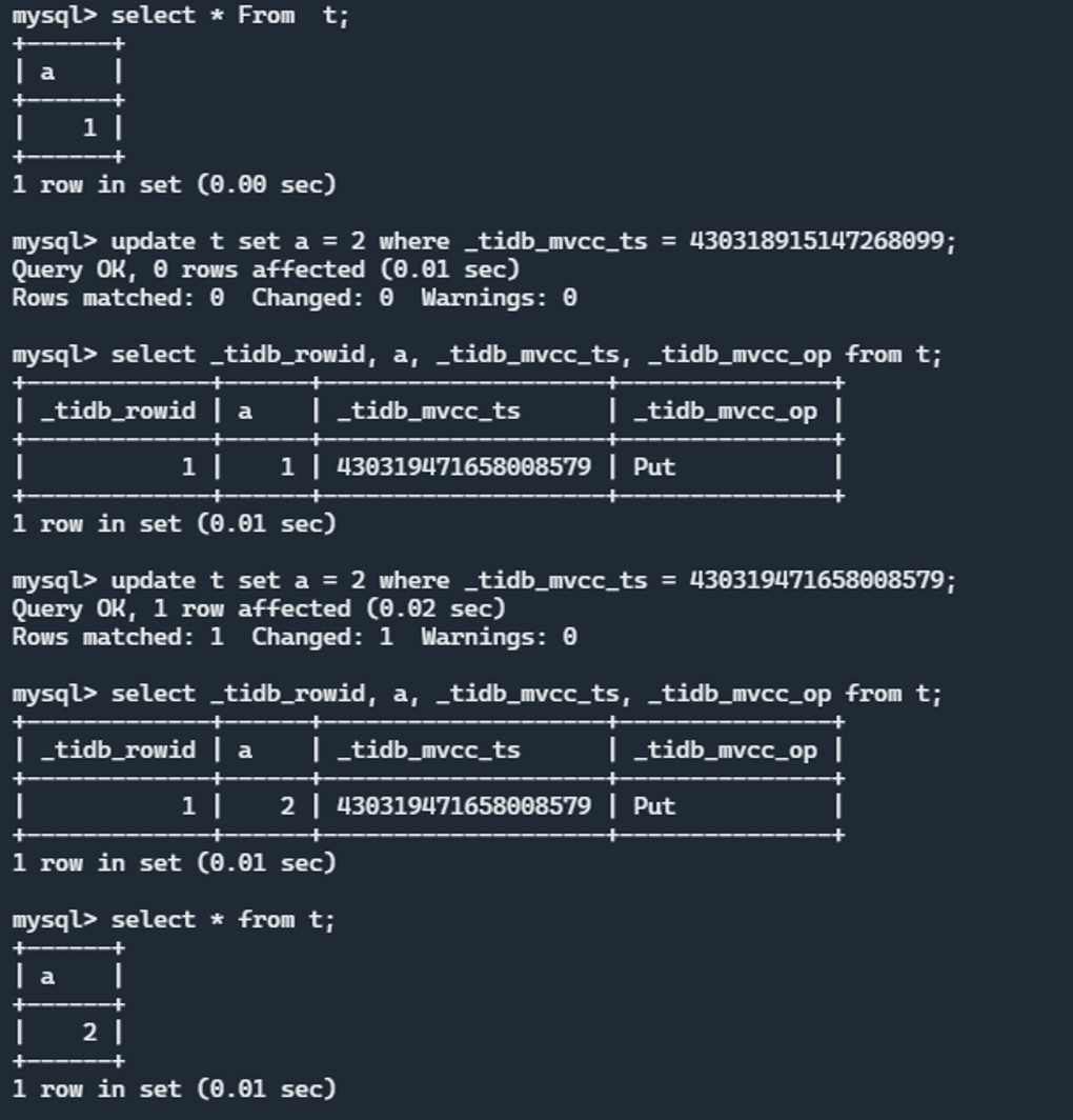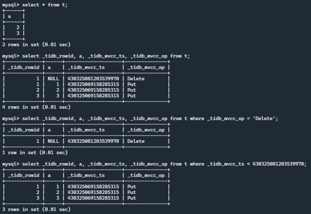 参考 _tidb_rowid 的实现,增加 _tidb_mvcc_ts ,_tidb_mvcc_op 虚拟列。 当查询虚拟列时,TiDB 发送给 TiKV 的请求中要带上标记,指明要查询 MVCC 虚拟列。 修改 TiKV 的 MVCC 读取逻辑,当需要查询虚拟列时,需要扫描所有版本,而不是只扫描最新版本。然后设置每条数据对应的虚拟列值。 _tidb_mvcc_ts 为事务的 commit_ts , _tidb_mvcc_op 为事务的操作类型,可以是 PUT 或 DELETE 。