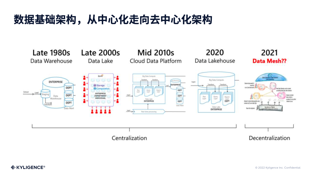大家看到,数据基础架构自“数仓”在1980年开始被提出到现在,已经经历了不同的变化。但在过去的几轮变化中,有一样东西没变——它们都是集中式的。也就是说,过去在构建数据仓库时,企业往往是把业务系统的数据从各个地方汇集过来,进行标准化的处理,再存放在一个地方。不管是 Teradata 还是 Hadoop,或是今天的 Snowflake、Redshift 等,都是类似的构建方式。