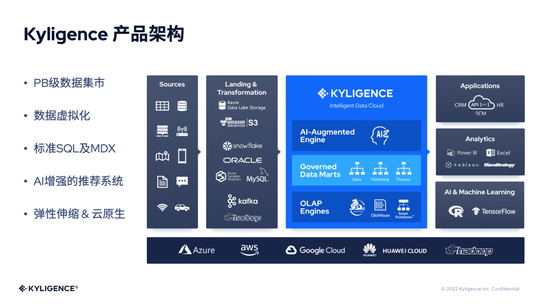如今 Kyligence 已经支持非常多的数据源,既包括 ClickHouse、Presto、Oracle 等等传统的数据源,也包括像 Elasticearch 这样的非结构化的数据源,我们也有 SDK 可以给到我们的客户或者是合作伙伴扩展整个的数据连接能力。