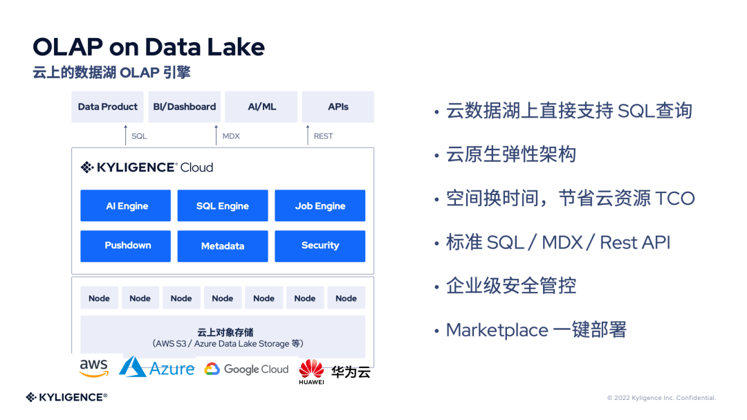 如今 Kyligence 的平台已经可以跑在纯云的架构上,不再有任何 Hadoop 的依赖。从公有云到私有云,我们都在不断地推进和演化。