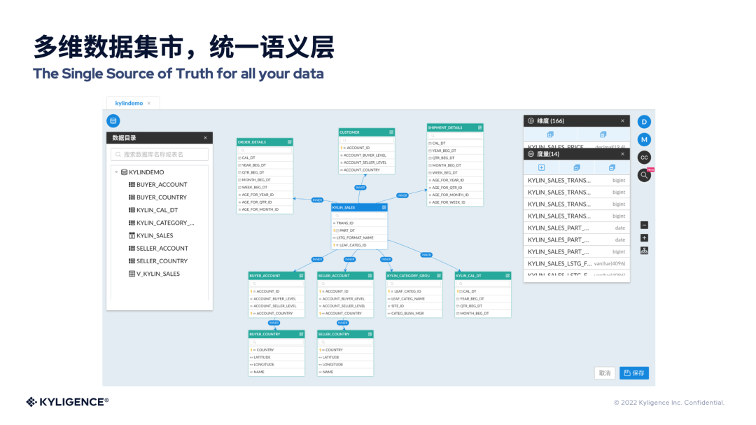 通过统一的语义层,Kyligence 为客户在云上构建了整个多维的数据集市。业务用户只要消费这样的数据集市,而无需关心这些是数据是来自 Oracle、Hadoop、Snowflake 还是 Kafka 的。用户甚至都不需要关心这是历史数据还是实时数据,通过 Kyligence 批流一体的能力,呈现给客户的就是业务数据的语义,业务人员只需要使用数据就可以了。