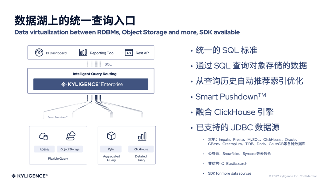 Kyligence 提供整个云上统一数据的访问入口,通过 Smart Pushdown 智能查询下压的能力,可以将 ANSI SQL 翻译成其他数据源。即使用户的数据集市没有被我们管理起来,也可以访问原始的数据源,将相应的 SQL Pushdown 过去,拿到相应的记录返回给客户端。