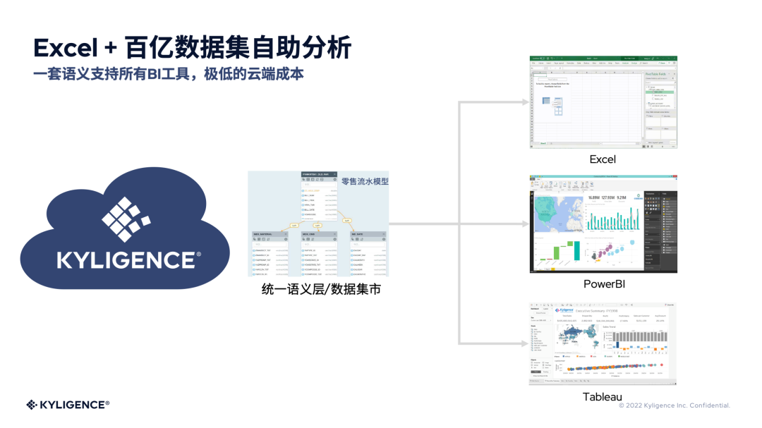 此外,Kyligence 统一的数据集市层能够更好地为业务部门去使用。「一次定义,多次使用」企业定义了一个统一的语义层,可以用到 Excel、Power BI、Tableau 以及其他更多的 BI 和数据消费工具里面,用户通过标准的 SQL 语句都可以访问。