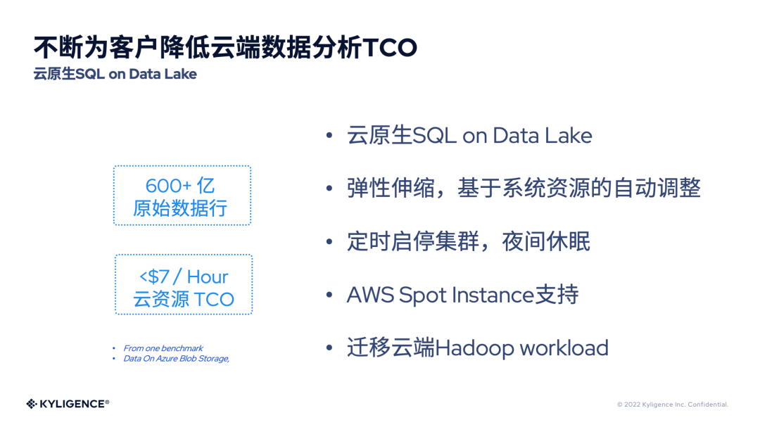 我们在云上一直在做的是:不断地为客户去降低云端数据分析的总体拥有成本。如前面提到的,用户直接可以把数据刷到 AWS S3,或者 Azure Blob Storage 上,Kyligence 直接可以提供 SQL 能力。在这个过程中我们提供弹性伸缩的能力,可以根据集群的使用量在高峰期拿更多的数据资源出来,在这些消费的低谷,可以更好地释放出相应的资源出来,更经济地利用好集群。我们还做到了定时的启停集群,尤其是晚上,我们完全可以把它关掉,从而进一步降低这方面的拥有成本。