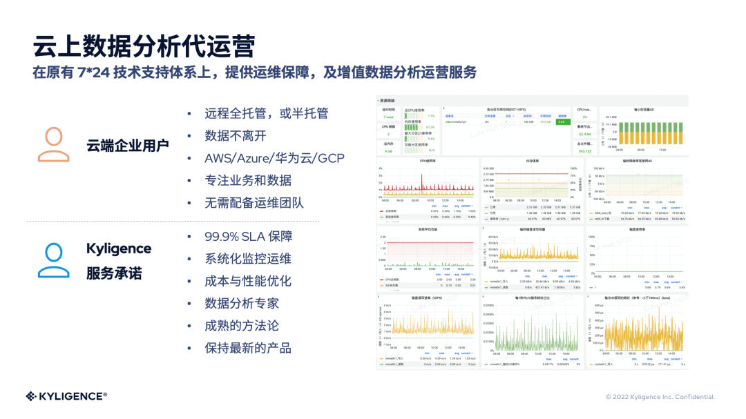 与此同时,我们还提供超过 99.9% 的 SLA 的保障,客户整个系统的监控运维、整个的技术栈的升级、相应的其他能力都由 Kyligence 来承担和服务,用户只要关心 API,和数据服务能够给到你什么即可。