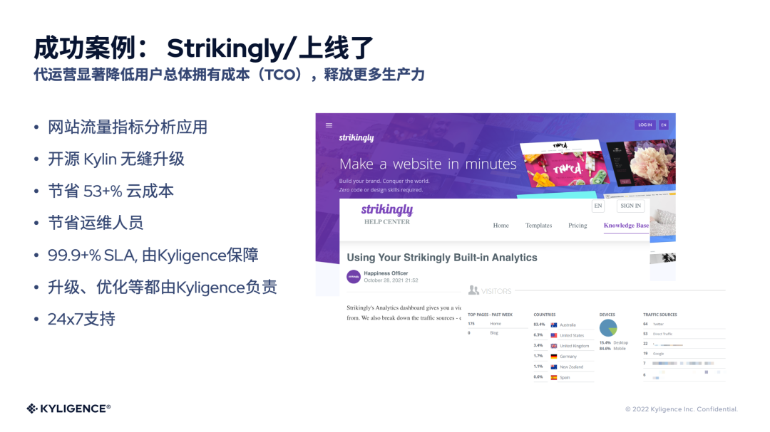 我们有一个非常成功的案例是来自 Strikingly (上线了)。他们原来是我们开源 Kylin 的用户,构建了非常好的、类似于 Google Analytics 的网络流量分析的平台,在过去一段时间里用得非常不错。去年,我们不仅仅把这样的应用迁移到了 Kyligence Cloud 上来,还提供了代运营能力,帮我们的客户省掉了 50% 以上的云的成本,在这个过程中帮他们去掉了云上的整个 Hadoop,同时省掉了运维团队。