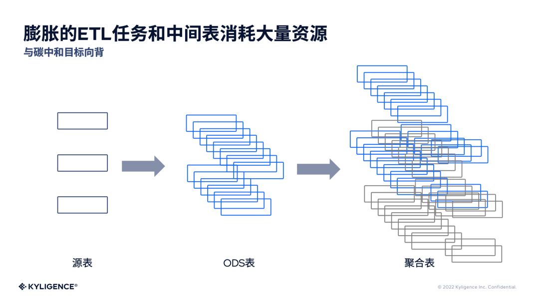 更焦虑的是,其实是整个的过程会让 ETL 任务和中间表进行大量的膨胀。我们有一个客户,一张原始的表产生了几万张的衍生表,同时在整个数仓里面有几百万张表。这不仅仅是存储的问题,它带来更大的挑战在于,它有无数的 ETL 的任务其实在不断地做着重复性的工作,不断地消耗整个数据集群的资源。