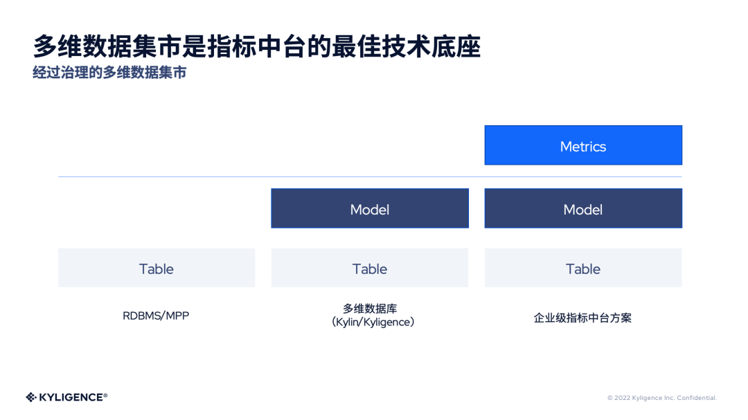 在 Kyligence 的解决方案里,我们会更多地关注整个数据集市层,关注以表为中心的方向。今天我们会从原来关注的以数据集市为中心,过渡到以数据集市及指标为中心的方向上。我们希望通过这样的多维集市能够为上层的指标提供更好的能力。我们也希望能够更好地跟其他的上下游进行合作,能够将这一块内容做得更好。