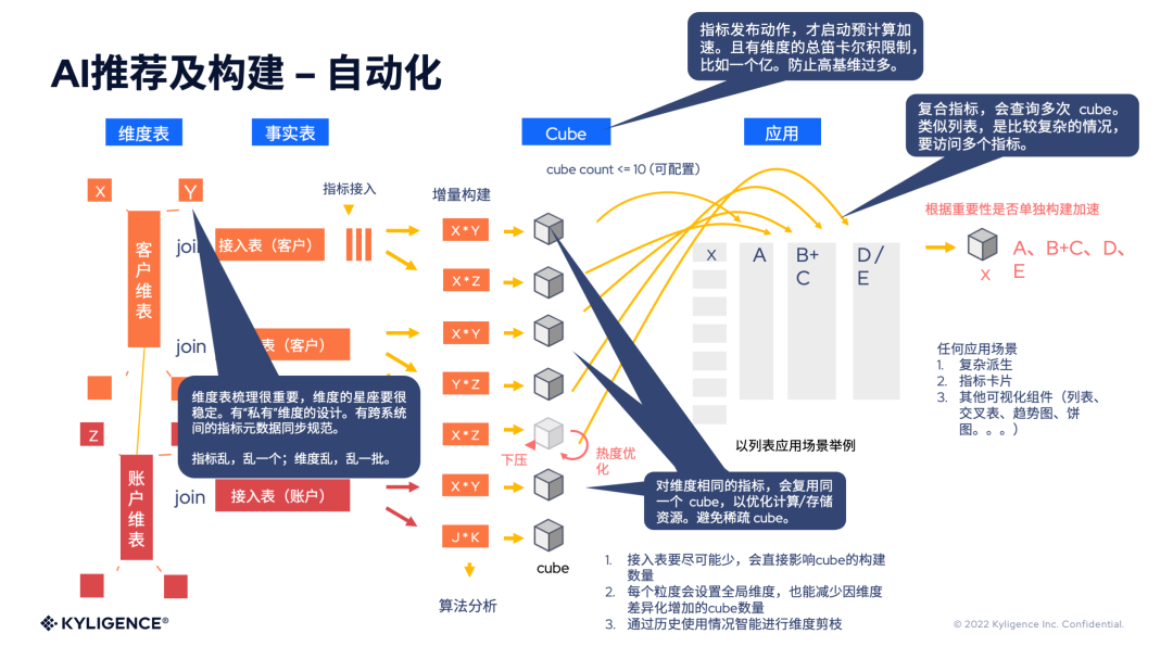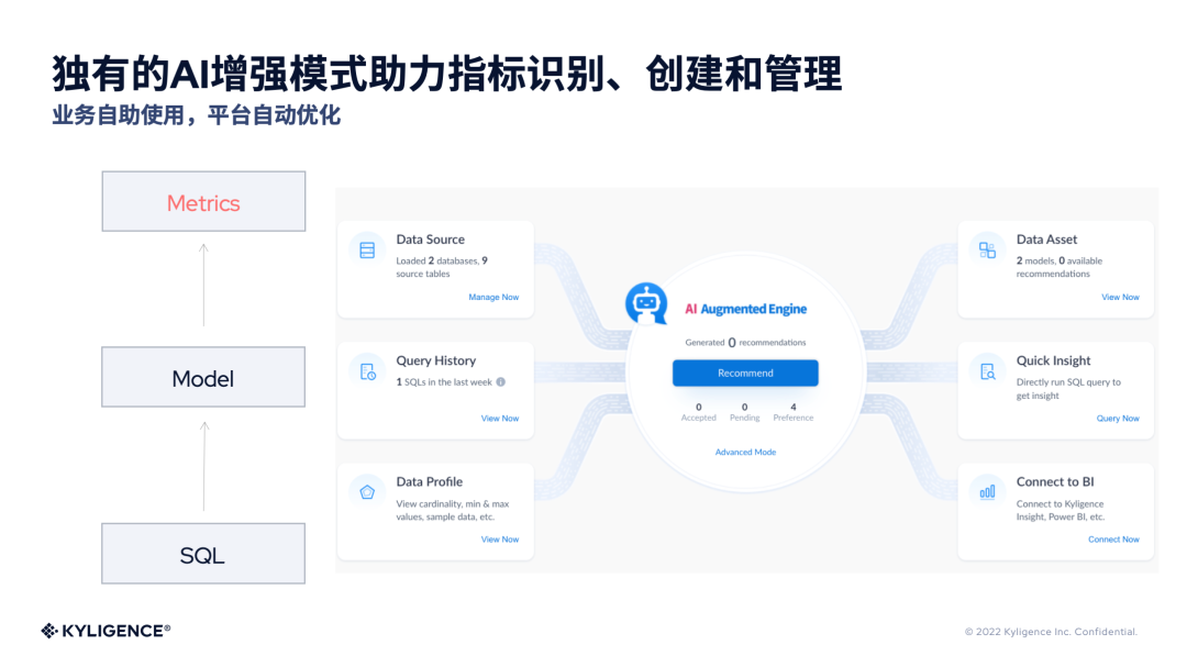 基于现有的 SQL,Kyligence 可以通过 AI 增强引擎推荐或者识别出相应的一些数据集市。基于这些数据集市可以进一步推荐出一些相应的重要指标。以前你可能需要人工使用它,今天可以通过系统自动化地进行推荐和治理。