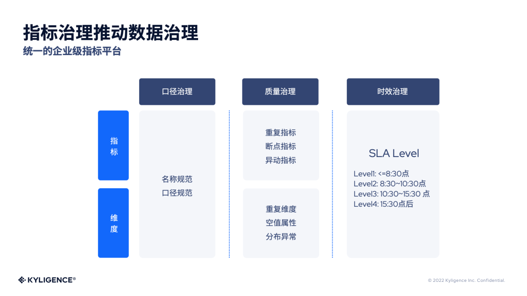 在这个过程中也看到,我们可以通过推动指标治理来做到更好的数据治理。因为只有指标被使用、被消费,数据才能发挥更大的价值。Kyligence 可以帮助企业管理口径的规范,比如重复的指标、异动的指标,还有一些空值分布的异常等。通过在指标层面上的应用,我们可以帮助客户去进一步地治理好整个背后的数据和能力。