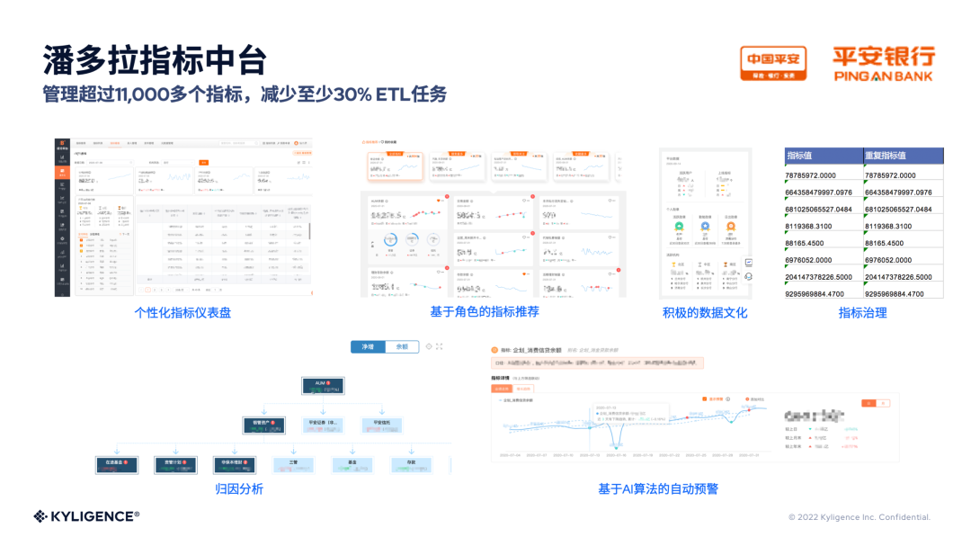 首先分享来自平安银行对外宣布的案例,Kyligence 目前帮平安银行管理了超过1.1万多个指标,这个指标里面 IT 团队只管了非常少的原子指标,其他的衍生指标全部是由业务团队自助进行制作和管理的。在这个过程中我们甚至减少了超过30%以上的 ETL 的任务,为整个的平台的优化和使用带来了非常大的保障。