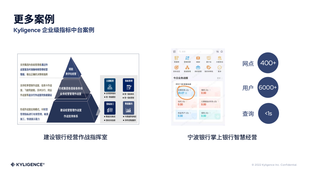 同时,我们还助力了建设银行的经营作战指挥室等基于指标的应用,从大屏到作战指挥室到整个的应用。同时,我们还服务了宁波银行,通过手机端的智慧经营来进行基于指标的业务管理模式,能够更好地去服务到业务增长和服务一线的业务人员去使用数据。