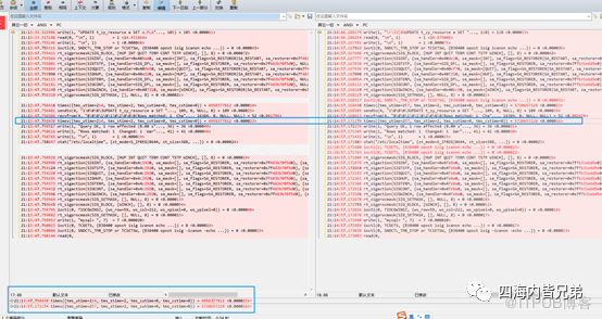 最下面出现的times就是14和23(也就是1.4毫秒和2.3毫秒),左边是5.7,右边是8。我们可以发现最大区别是8里面多了ioctl多了几次。查阅了一下资料,可能关系不大。因为下面这个蓝色显示8还快一点。