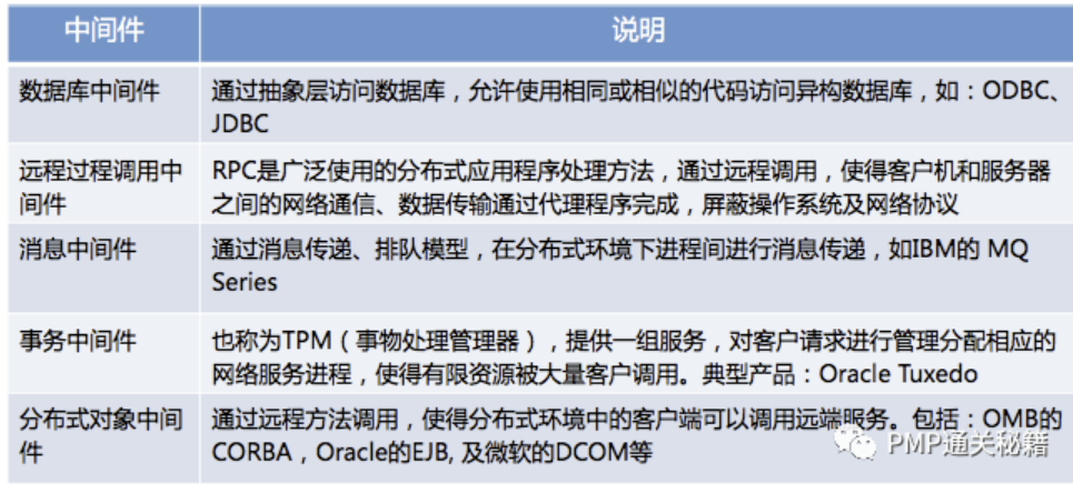 4. 软件三层架构中,()是位于硬件、操作系统等平台和应用之间的通用服务,用于解决分布系统的异构问题,实现应用与平台的无关性。