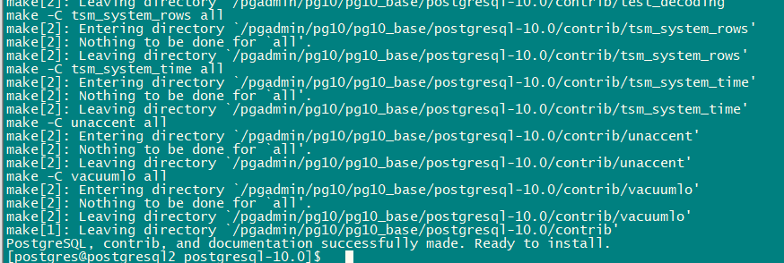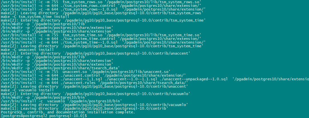 cp postgresql-10.0.tar.gz tmp/soft tar -xvf postgresql-10.0.tar.gz --编译安装 cd postgresql-10.0 ./configure --prefix=/pgadmin/postgres10 make world make install-world |