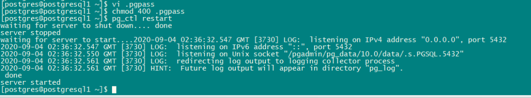 cd /home/postgresql vi .pgpass #主数据库IP:主数据库端口号:replication:replica:replica 192.168.20.101:5432:replica:replica chmod 400 .pgpass #重启数据库 pg_ctl restart |