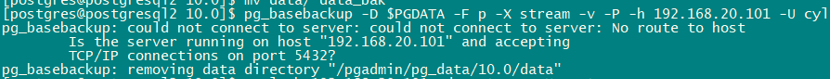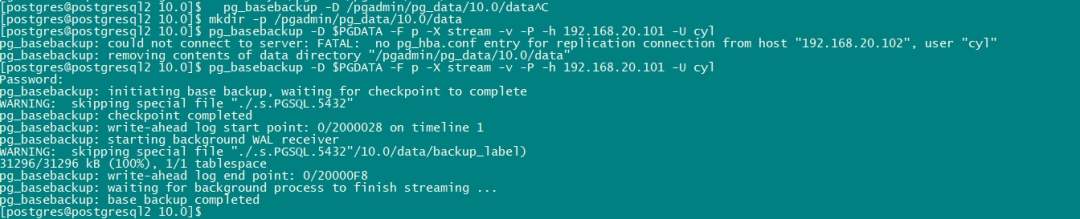 pg_basebackup -D $PGDATA -F p -X stream -v -P -h 192.168.20.101 -U cyl |