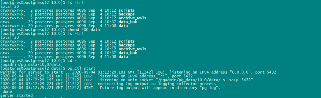 [postgres@postgresql2 data]$ pg_ctl start waiting for server to start....2020-09-04 03:11:25.151 GMT [11232] FATAL: data directory "/pgadmin/pg_data/10.0/data" has group or world access 2020-09-04 03:11:25.151 GMT [11232] DETAIL: Permissions should be u=rwx (0700). stopped waiting pg_ctl: could not start server Examine the log output. [postgres@postgresql2 data]$ |
