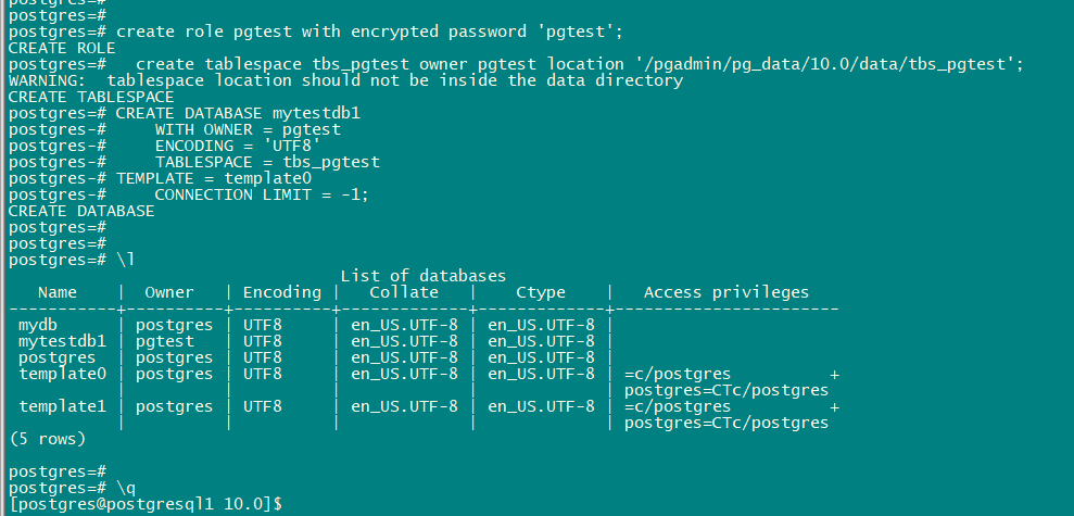 [postgres@postgresql1 data]$ pg_ctl start pg_ctl: another server might be running; trying to start server anyway waiting for server to start....2020-09-04 02:04:48.182 GMT [3524] LOG: listening on IPv4 address "0.0.0.0", port 5432 2020-09-04 02:04:48.182 GMT [3524] LOG: listening on IPv6 address "::", port 5432 2020-09-04 02:04:48.186 GMT [3524] LOG: listening on Unix socket "/pgadmin/pg_data/10.0/data/.s.PGSQL.5432" 2020-09-04 02:04:48.222 GMT [3524] LOG: redirecting log output to logging collector process 2020-09-04 02:04:48.222 GMT [3524] HINT: Future log output will appear in directory "pg_log". done server started [postgres@postgresql1 data]$ [postgres@postgresql1 data]$ ps -ef|grep postgres root 3465 2596 0 09:59 pts/0 00:00:00 su - postgres postgres 3466 3465 0 09:59 pts/0 00:00:00 -bash postgres 3524 1 0 10:04 pts/0 00:00:00 /pgadmin/postgres10/bin/postgres postgres 3525 3524 0 10:04 ? 00:00:00 postgres: logger process postgres 3527 3524 0 10:04 ? 00:00:00 postgres: checkpointer process postgres 3528 3524 0 10:04 ? 00:00:00 postgres: writer process postgres 3529 3524 0 10:04 ? 00:00:00 postgres: wal writer process postgres 3530 3524 0 10:04 ? 00:00:00 postgres: autovacuum launcher process postgres 3531 3524 0 10:04 ? 00:00:00 postgres: stats collector process postgres 3532 3524 0 10:04 ? 00:00:00 postgres: bgworker: logical replication launcher postgres 3533 3466 7 10:04 pts/0 00:00:00 ps -ef postgres 3534 3466 0 10:04 pts/0 00:00:00 grep postgres [postgres@postgresql1 data]$ [postgres@postgresql1 data]$ pg_ctl -m fast stop waiting for server to shut down.... done server stopped [postgres@postgresql1 data]$ pg_ctl restart pg_ctl: PID file "/pgadmin/pg_data/10.0/data/postmaster.pid" does not exist Is server running? starting server anyway waiting for server to start....2020-09-04 02:05:25.327 GMT [3538] LOG: listening on IPv4 address "0.0.0.0", port 5432 2020-09-04 02:05:25.327 GMT [3538] LOG: listening on IPv6 address "::", port 5432 2020-09-04 02:05:25.330 GMT [3538] LOG: listening on Unix socket "/pgadmin/pg_data/10.0/data/.s.PGSQL.5432" 2020-09-04 02:05:25.336 GMT [3538] LOG: redirecting log output to logging collector process 2020-09-04 02:05:25.336 GMT [3538] HINT: Future log output will appear in directory "pg_log". done server started [postgres@postgresql1 data]$ ps -ef | grep postgres root 3465 2596 0 09:59 pts/0 00:00:00 su - postgres postgres 3466 3465 0 09:59 pts/0 00:00:00 -bash postgres 3538 1 0 10:05 pts/0 00:00:00 /pgadmin/postgres10/bin/postgres postgres 3539 3538 0 10:05 ? 00:00:00 postgres: logger process postgres 3541 3538 0 10:05 ? 00:00:00 postgres: checkpointer process postgres 3542 3538 0 10:05 ? 00:00:00 postgres: writer process postgres 3543 3538 0 10:05 ? 00:00:00 postgres: wal writer process postgres 3544 3538 0 10:05 ? 00:00:00 postgres: autovacuum launcher process postgres 3545 3538 0 10:05 ? 00:00:00 postgres: stats collector process postgres 3546 3538 0 10:05 ? 00:00:00 postgres: bgworker: logical replication launcher postgres 3547 3466 2 10:05 pts/0 00:00:00 ps -ef postgres 3548 3466 0 10:05 pts/0 00:00:00 grep postgres [postgres@postgresql1 data]$ psql -h 127.0.0.1 -d postgres -U postgres psql (10.0) Type "help" for help. postgres=# |