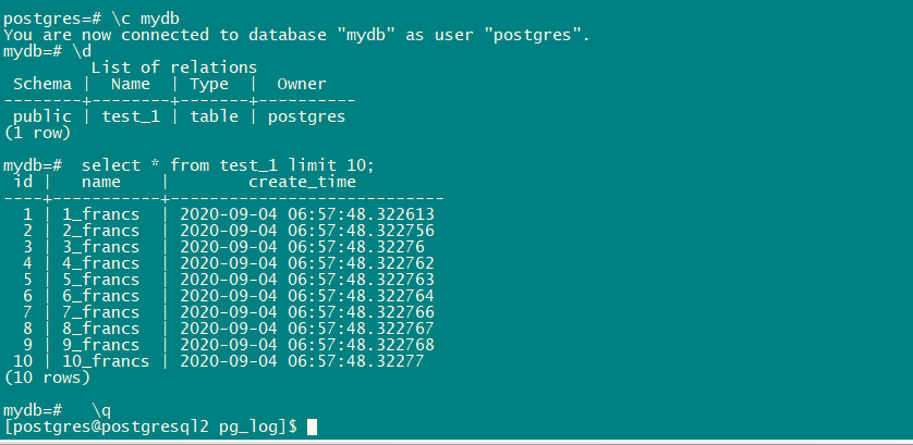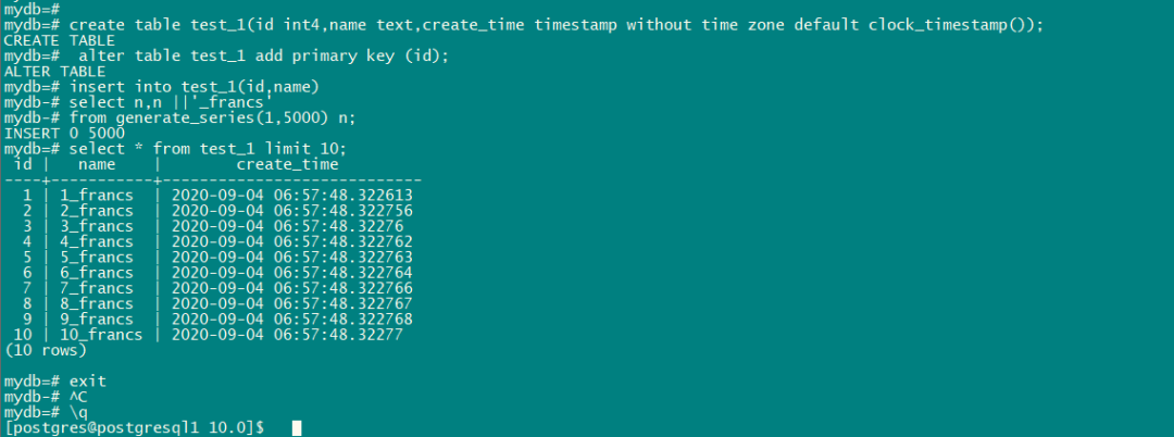 create table test_1(id int4,name text,create_time timestamp without time zone default clock_timestamp()); alter table test_1 add primary key (id); insert into test_1(id,name) select n,n ||'_francs' from generate_series(1,5000) n; select * from test_1 limit 10; |