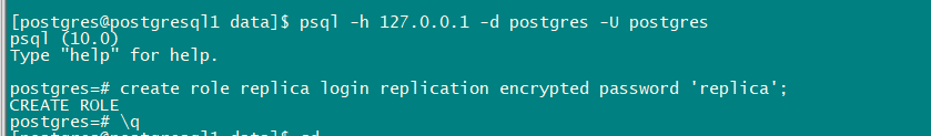 su - postgresql psql -h 127.0.0.1 -d postgres -U postgres 登录数据库 create role replica login replication encrypted password 'replica'; 创建用户 |