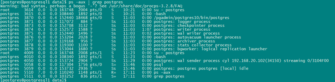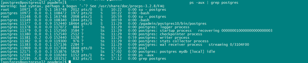 2、在备库的服务器上输入命令,会看到多出一个wal receiver process的进程:#ps -aux | greppostgres