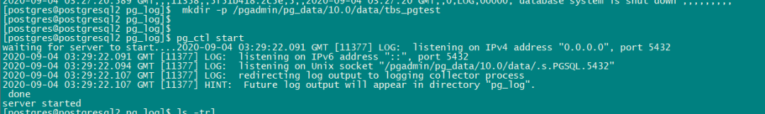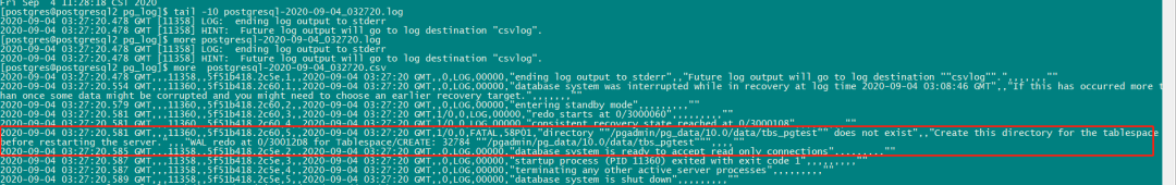 [postgres@postgresql2 pg_log]$ more postgresql-2020-09-04_032720.csv 2020-09-04 03:27:20.478 GMT,,,11358,,5f51b418.2c5e,1,,2020-09-04 03:27:20 GMT,,0,LOG,00000,"ending log output to stderr",,"Future log output will go to log destination ""csvlog"".",,,,,,,"" 2020-09-04 03:27:20.554 GMT,,,11360,,5f51b418.2c60,1,,2020-09-04 03:27:20 GMT,,0,LOG,00000,"database system was interrupted while in recovery at log time 2020-09-04 03:08:46 GMT",,"If this has occurred more t han once some data might be corrupted and you might need to choose an earlier recovery target.",,,,,,,"" 2020-09-04 03:27:20.579 GMT,,,11360,,5f51b418.2c60,2,,2020-09-04 03:27:20 GMT,,0,LOG,00000,"entering standby mode",,,,,,,,,"" 2020-09-04 03:27:20.581 GMT,,,11360,,5f51b418.2c60,3,,2020-09-04 03:27:20 GMT,1/0,0,LOG,00000,"redo starts at 0/3000060",,,,,,,,,"" 2020-09-04 03:27:20.581 GMT,,,11360,,5f51b418.2c60,4,,2020-09-04 03:27:20 GMT,1/0,0,LOG,00000,"consistent recovery state reached at 0/3000108",,,,,,,,,"" 2020-09-04 03:27:20.581 GMT,,,11360,,5f51b418.2c60,5,,2020-09-04 03:27:20 GMT,1/0,0,FATAL,58P01,"directory ""/pgadmin/pg_data/10.0/data/tbs_pgtest"" does not exist",,"Create this directory for the tablespace before restarting the server.",,,"WAL redo at 0/30012D8 for Tablespace/CREATE: 32784 ""/pgadmin/pg_data/10.0/data/tbs_pgtest""",,,,"" 2020-09-04 03:27:20.585 GMT,,,11358,,5f51b418.2c5e,2,,2020-09-04 03:27:20 GMT,,0,LOG,00000,"database system is ready to accept read only connections",,,,,,,,,"" 2020-09-04 03:27:20.587 GMT,,,11358,,5f51b418.2c5e,3,,2020-09-04 03:27:20 GMT,,0,LOG,00000,"startup process (PID 11360) exited with exit code 1",,,,,,,,,"" 2020-09-04 03:27:20.587 GMT,,,11358,,5f51b418.2c5e,4,,2020-09-04 03:27:20 GMT,,0,LOG,00000,"terminating any other active server processes",,,,,,,,,"" 2020-09-04 03:27:20.589 GMT,,,11358,,5f51b418.2c5e,5,,2020-09-04 03:27:20 GMT,,0,LOG,00000,"database system is shut down",,,,,,,,,"" [postgres@postgresql2 pg_log]$ mkdir -p /pgadmin/pg_data/10.0/data/tbs_pgtest [postgres@postgresql2 pg_log]$ |