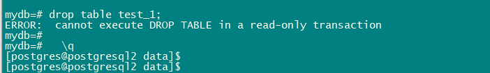 [postgres@postgresql2 10.0]$ pg_basebackup -D $PGDATA -F p -X stream -v -P -h 192.168.20.101 -U cyl pg_basebackup: could not connect to server: FATAL: no pg_hba.conf entry for replication connection from host "192.168.20.102", user "cyl" pg_basebackup: removing contents of data directory "/pgadmin/pg_data/10.0/data" [postgres@postgresql2 10.0]$ pg_basebackup -D $PGDATA -F p -X stream -v -P -h 192.168.20.101 -U cyl Password: pg_basebackup: initiating base backup, waiting for checkpoint to complete WARNING: skipping special file "./.s.PGSQL.5432" pg_basebackup: checkpoint completed pg_basebackup: write-ahead log start point: 0/2000028 on timeline 1 pg_basebackup: starting background WAL receiver WARNING: skipping special file "./.s.PGSQL.5432"/10.0/data/backup_label) 31296/31296 kB (100%), 1/1 tablespace pg_basebackup: write-ahead log end point: 0/20000F8 pg_basebackup: waiting for background process to finish streaming ... pg_basebackup: base backup completed [postgres@postgresql2 10.0]$ |