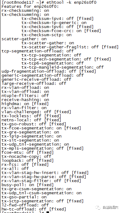 ethtool -k可以查看网卡上的各个开关的状态,有时候调整这些开关可以起到优化的作用。