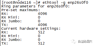 ethtool -g可以查看ring buffer的状态,网络流量过大,ring buffer不足会导致大量的overruns和dropped的包产生。(明天的另外一篇文章里,老白会详细介绍网络诊断的一些常用流程)。