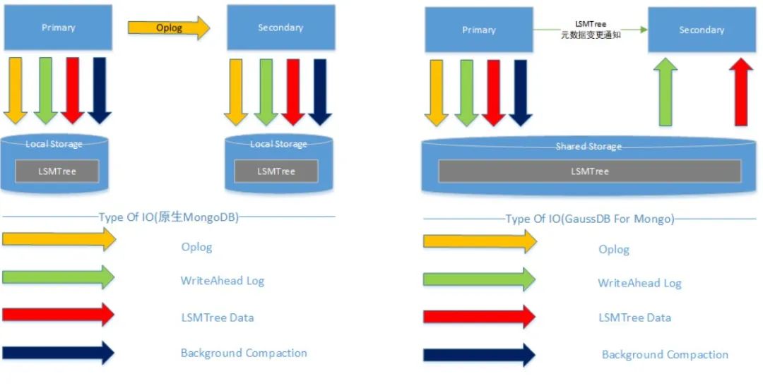 传统社区版MongoDB副本集基于Oplog做数据复制,只读节点需要镜像主节点的所有写IO操作。GaussDB(for Mongo) 的只读节点和主节点共享同一份底层数据库文件(LSMTree的SST文件),只读节点并不自己生成SST文件。