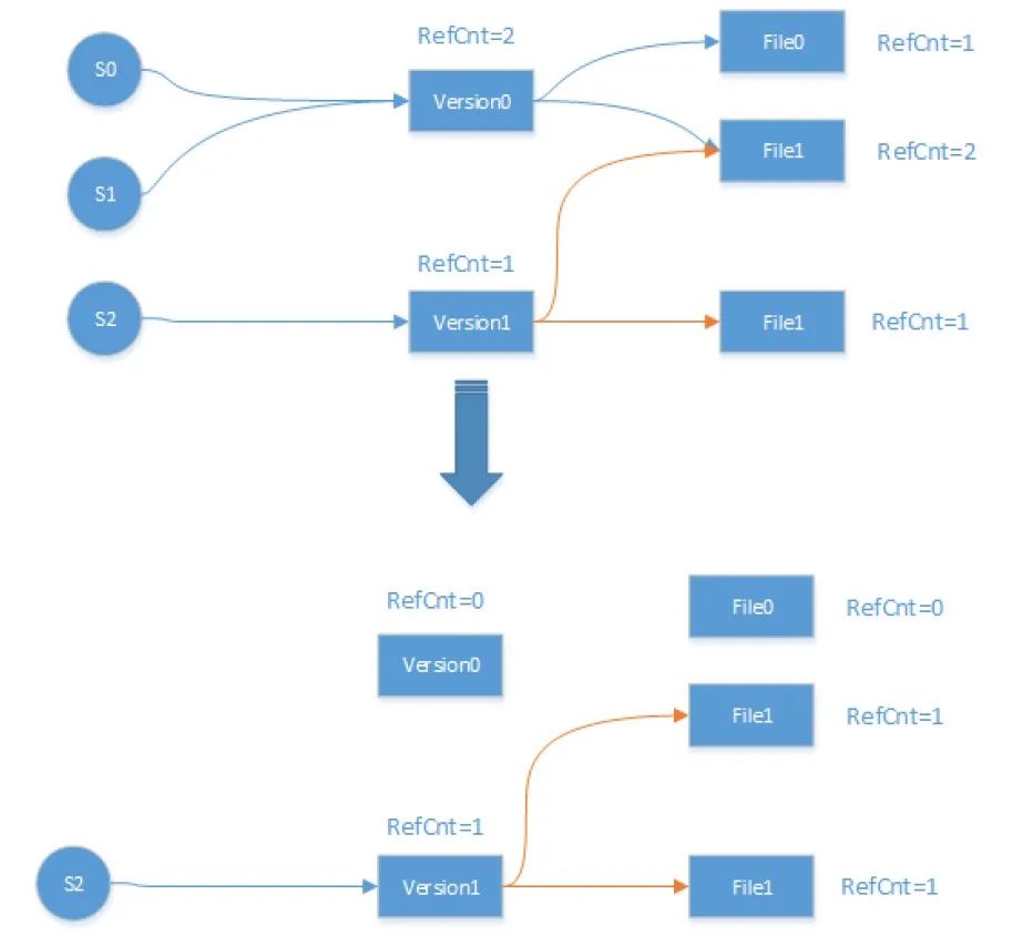 sst文件和wal的文件的生命周期由主节点负责。RocksDB中,SST文件通过层级的引用计数来维持不被删除。如下图,RocksDB的每个游标会维持SuperVersion,如下图中的S0,S1,S2。每个SuperVersion会引用一个Version,一个Version代表LSMTree在不断变形(通过增删SST文件变形)的过程中,某个时间点的形状,最新的Version就代表LSMTree当前的形状。