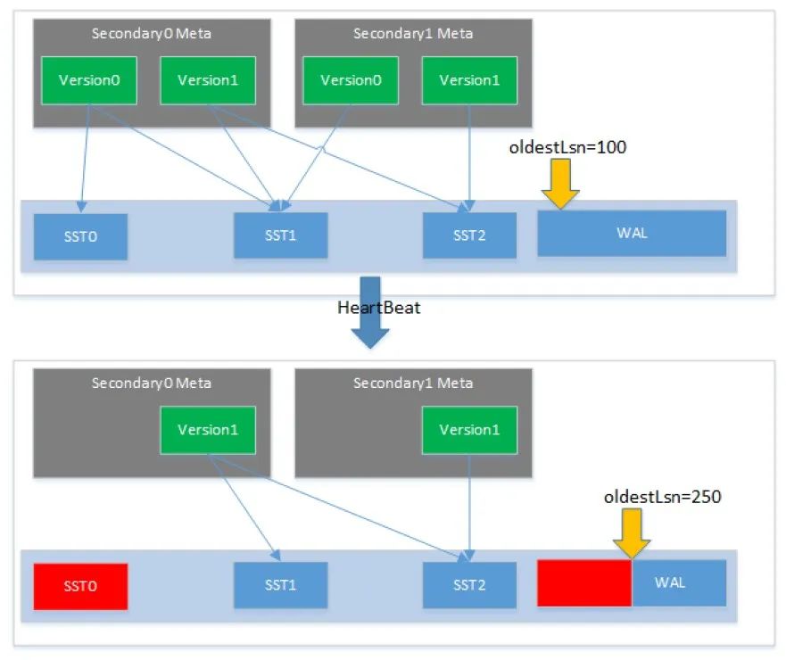 如下图所示,在经历一次心跳后,主节点发现Secondary0的Version0和Secondary1的Version0不再使用。删除这两个Version后,SST0的引用计数为0,表示SST0可以被删除。OldestLsn也从100推进到了250,可以清理掉250之前的WAL。