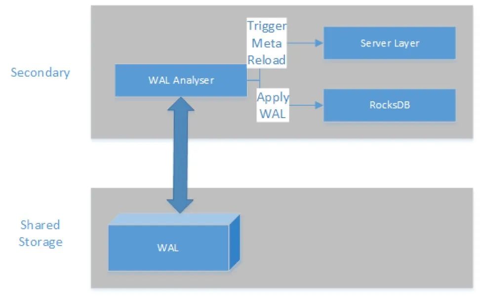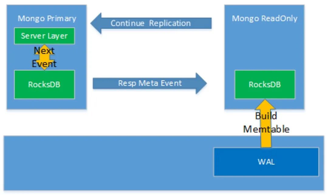 传统的复制,数据流从Oplog来,走一遍完整的数据库Server层CRUD接口,再落到引擎层。这种逻辑和主节点上业务的写入逻辑是一致的,因此Server层的一些内存元数据结构,在这个过程中就自然而然的得到更新了。但是当采用基于WAL的复制后,整个WritePath并不经过只读节点的Server层。因此Server层的内存元数据更新,就是一个很大的挑战。在这里,只读节点对每一条WAL做分析,如果WAL的内容会影响Mongo内存元数据,就会reload对应的元数据模块。
