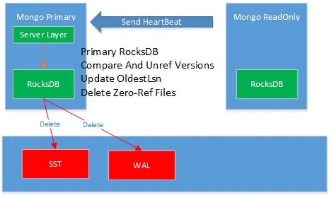在GaussDB(for Mongo)中,主节点会记录所有只读节点在使用的Version,并为这些Version增加引用计数从而维持SST文件的生命周期。