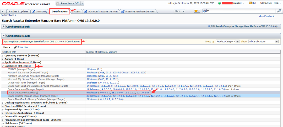 注意:OEMCC13.3对OMR数据库版本是有要求的,具体内容查看MOS上的认证信息: