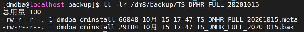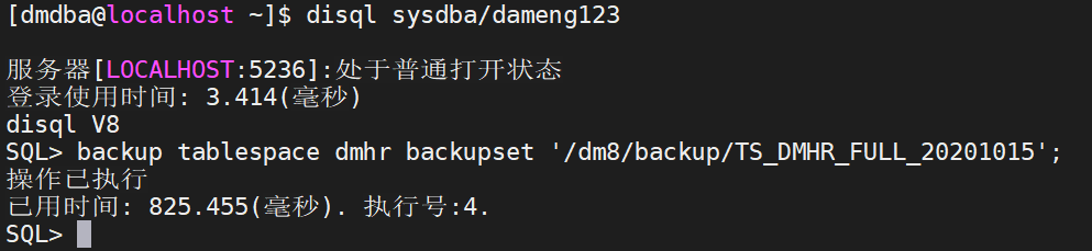 SQL> backup tablespace dmhr backupset '/dm8/backup/TS_DMHR_FULL_20201015';