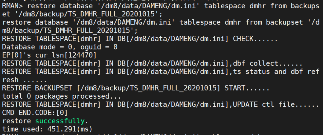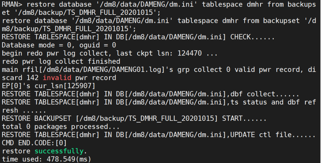 RMAN>restore database '/dm8/data/DAMENG/dm.ini' tablespace dmhr frombackupset '/dm8/backup/TS_DMHR_FULL_20201015';