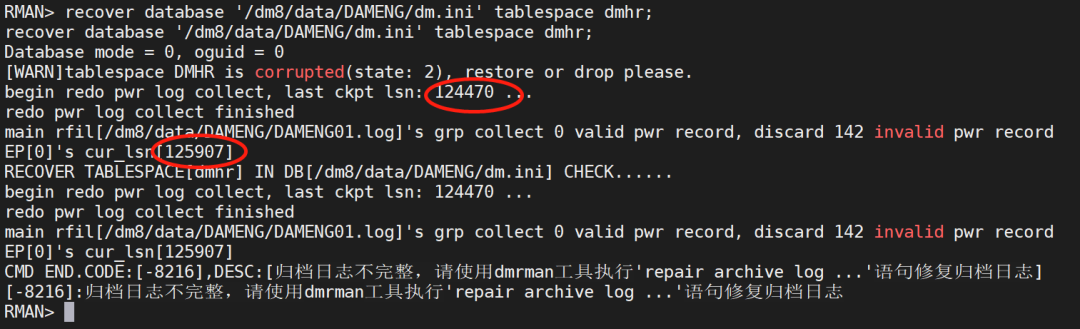 还原后执行表空间恢复,报错[-8216]:归档日志不完整。