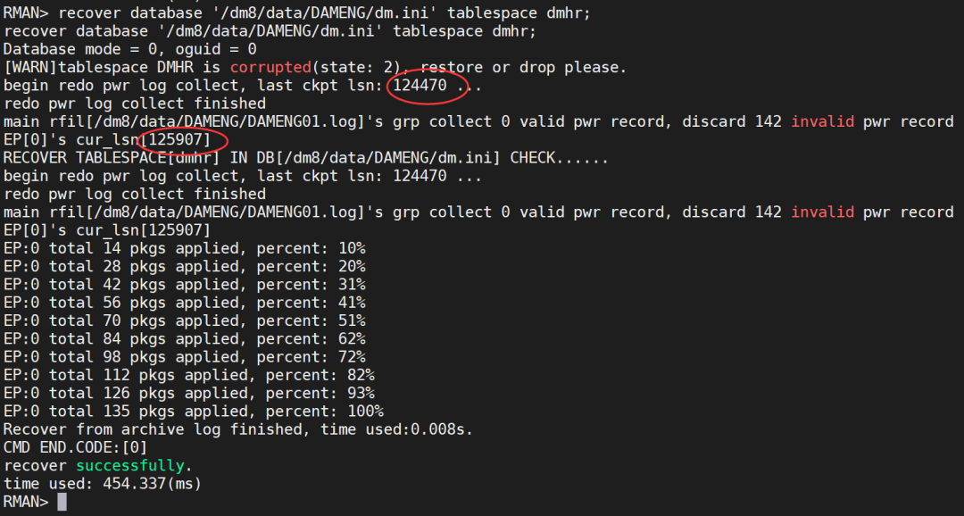 RMAN>recover database '/dm8/data/DAMENG/dm.ini' tablespace dmhr;