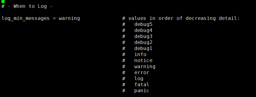 首先我们先从日志的详细度来入手,log_min_messages定义了日志的详细程度,其实我们在选择上可能会有一些纠结,纠结点在error、warning、notice这三种,大部分人可能在选择error,出错就报错误,warning也有相关选择,实际上选择不同的日志的详细度也是有相关的一些考虑。