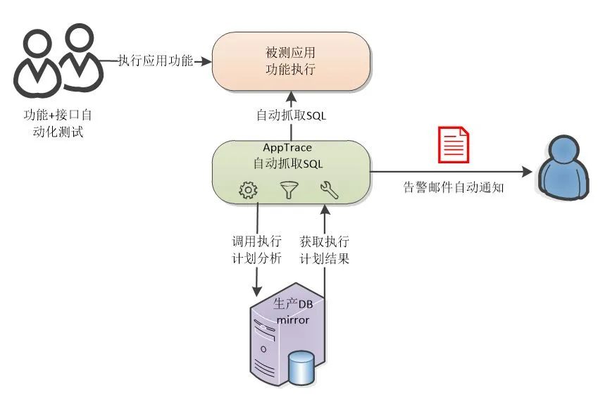 1)功能测试和接口测试时,AppTrace抓取测试执行过程中的所有SQL。通过功能和接口测试实现对应用功能的全量覆盖,使得应用中的SQL几乎都会被抓取到。2)AppTrace将抓取到的SQL请求到生产mirror库中去获取执行计划,以此获得与生产近似的执行分析结果。3)对分析结果为疑似存在性能问题的SQL进行告警,由人工确认、优化。